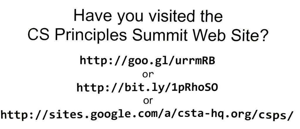 One of the events of last week was the National Computer Science Principles Summit. I tweeted about it a lot but you can get a lot of the resources and videos at the CS Principles Summit web site.